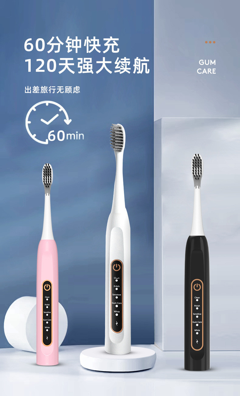 Uno spazzolino da denti sonico è più efficace di uno spazzolino da denti regolare nell'eliminazione la placca e del tartaro come pure nell'eliminazione gli angoli e delle lacune morti nella cavità orale. Lo spazzolino da denti sonico è una piccola testa brevettata della spazzola che genera la vibrazione ad alta frequenza con la frequenza della vibrazione sonica. Rompe la sporcizia allegata alla superficie dei denti e con arrossirsi continuo di innaffiato con acqua con la forza di pulizia di variazione, può efficacemente rimuovere i fattori patogeni nella cavità orale e nella dentatura, quali il tartaro, la placca batterica, i punti del fumo ed i pigmenti; per raggiungere lo scopo di impedire e di trattamento del periodontitis e gengivite, carie dentale di rilevazione e di trattamento tempestiva ed impedire cattivo respiro ed odore.